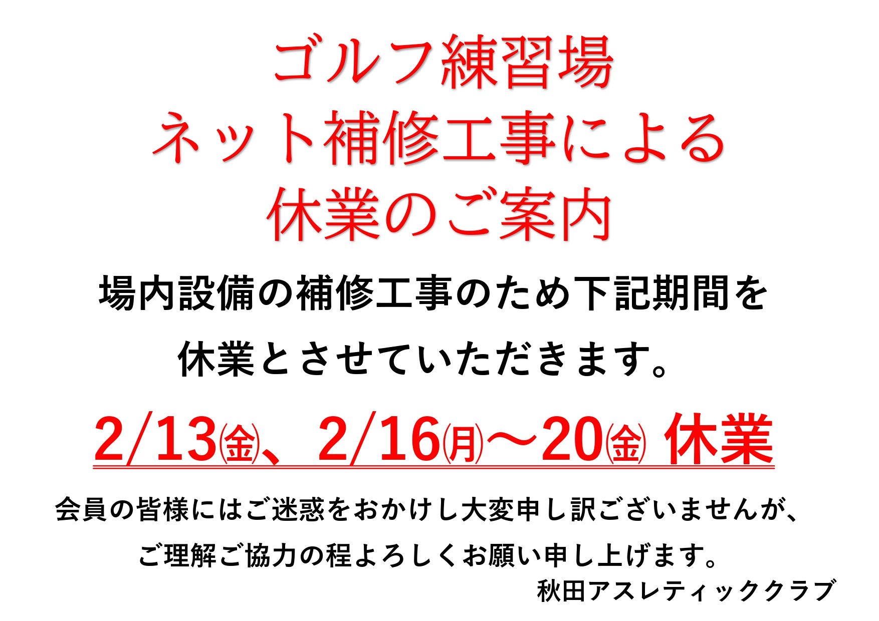 ⛳ゴルフ練習場 2/13、2/16~2/20休業のお知らせ