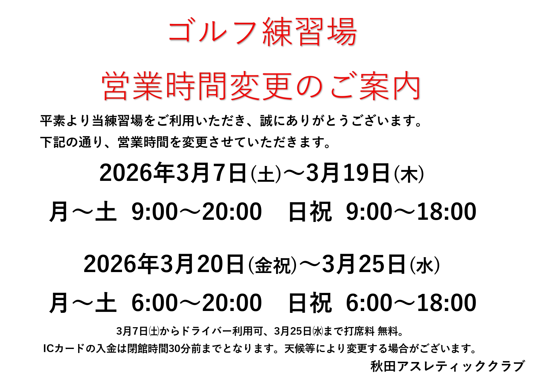⛳ゴルフ練習場 3/7~3/25 営業時間変更のお知らせ