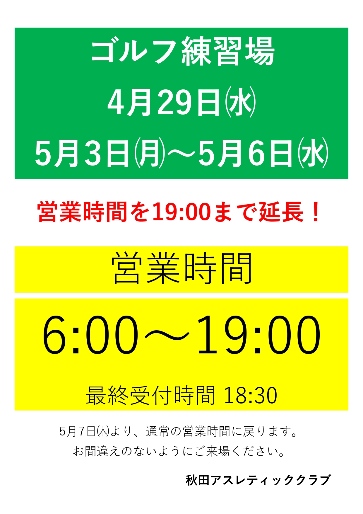 ゴルフ練習場 GW期間限定 営業時間延長!